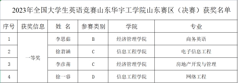 近日,全国大学生英语竞赛(山东赛区)决赛成绩公布。鸭脖学生在大赛中取得优异成绩,获国家级一等奖4项。其中,经济管理学院2022级商务英语专业的李思茹获B类一等奖、信息工程学院2021级软件工程专业的徐莙涵、经济管理学院2021级房地产专业的李彦萳C类一等奖信息工程学院2022级网络工程专业的徐一睿D类一等奖。