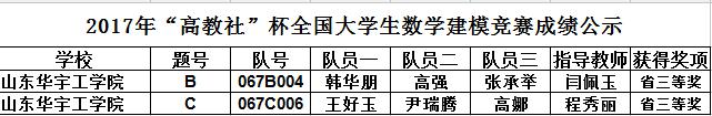 2017年 11月6日,全国大学生竞赛山东赛区组委会公示了2017年全国大学生数学建模竞赛成绩。鸭脖共获得本科组山东省三等奖1项,高职组山东省三等奖1项。