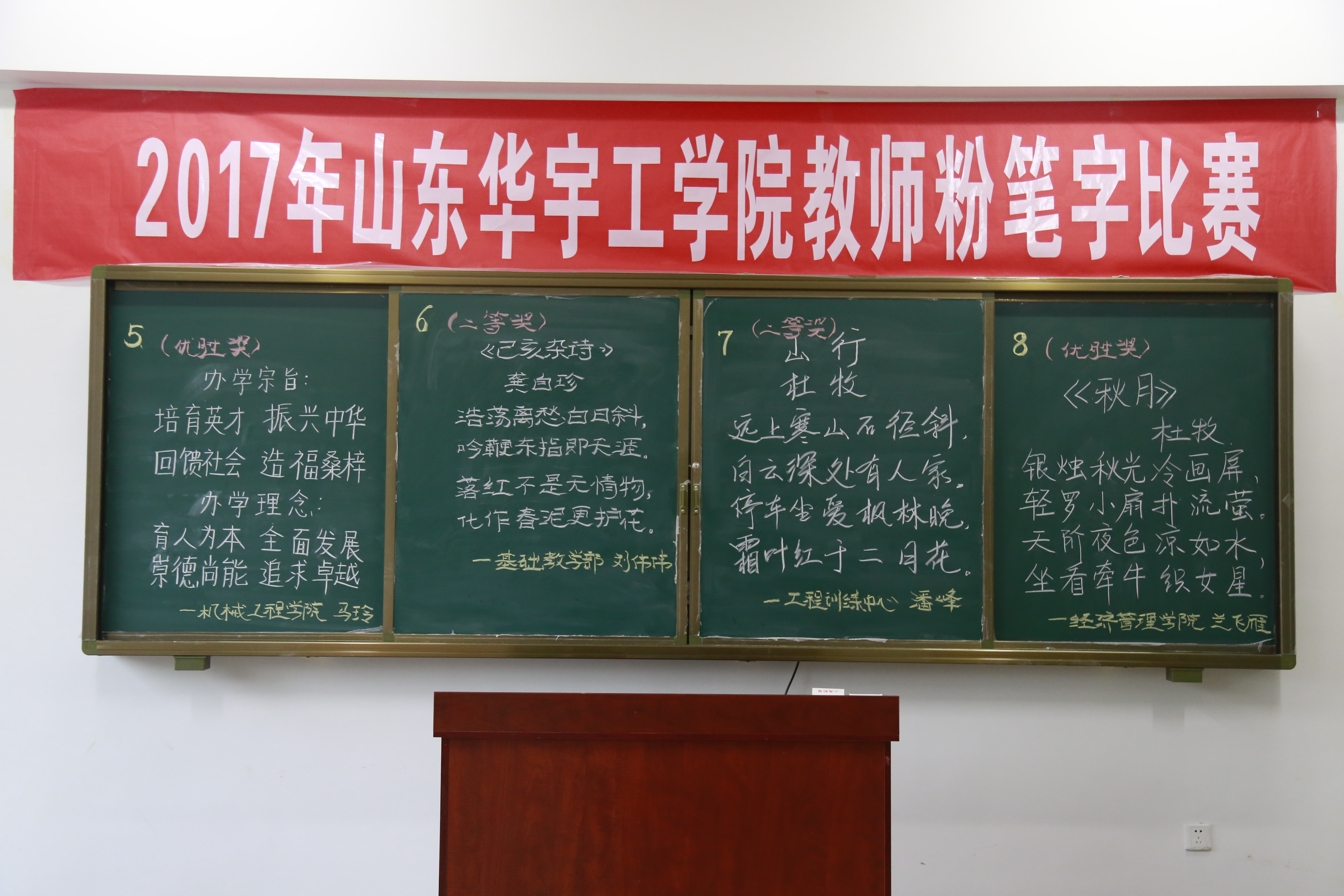 为积极引导鸭脖教师重视教学基本功训练,强化板书设计意识,养成写规范字的习惯,9月25日下午,鸭脖在21号教学楼举办2017年山东华宇工学院教师粉笔字比赛。本次比赛由教务处主办,基础教学部协办,教务处处长贺红岩、各部门领导及部分任课教师观摩了比赛。