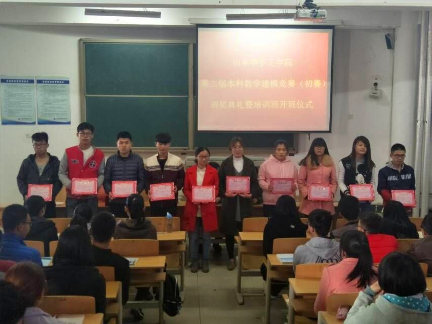 活动由陆春霞老师主持。活动中,首先由数学教研室主任闫佩玉介绍第二届本科数学建模竞赛(初赛)的情况。主要从比赛时间、比赛规模、比赛形式等几方面进行详细介绍。其次,主持人宣读获奖名单,其他老师为获奖同学颁发了荣誉证书。最后,闫佩玉老师进行了总结发言,阐述了数学建模的重要性和此次培训计划,并提出了培训的具体要求。鼓励同学们坚持不懈、开拓创新、团结协作,争取在2017年全国大学生数学建模竞赛中取得更好的成绩。