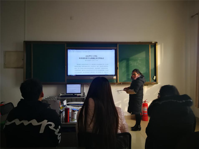 为了高效、有序地开展新学期教育教学工作,2月22日下午物理教研室主任解振平带领全体教师共同学习了《山东华宇工学院人才培养方案管理规定》、 《山东华宇工学院本科课程教学大纲制定及管理办法》、 《山东华宇工学院课程授课计划编制及管理规定》、 《山东华宇工学院教案编写的基本要求》、《山东华宇工学院集体备课制度》等相关文件。