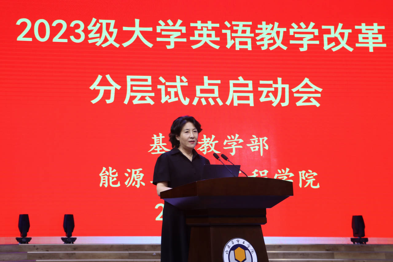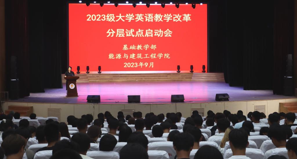 为进一步推动鸭脖大学英语分层教学试点工作的开展,明确教学任务和目标,保证试点班级学生对大学英语的教学模式、教学方法有充分地了解,2023年9月22日下午16点,基础教学部在国际文化交流中心组织召开大学英语教学改革分层试点启动会。此次会议由外语教研室主任刘伟伟主持,基础教学部主任刘瑞平、主任助理门顺德、试点班大学英语教师、能源与建筑工程学院学管科长王强老师和2023级10个试点班400余名学生共同参加了此次会议。